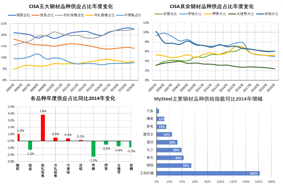 从近些年主要钢铁品种供应变化幅度来看,仅钢筋、热轧板卷、冷轧板卷、中厚板和涂镀五大品种同比供应有所增加,增产原因则主要在于国内房地产、基建、家电、汽车、机械等行业发展迅速,加之产能集中度较高,企业发展规划较为齐全。而线盘、带钢、钢管、型钢等品种国内供应出现明显下降。其中线盘、带钢减产主因则在于品种替代性偏高,而钢管和型钢供应水平偏低主要则在于下游终端行业,例如能源化工、钢结构工程等行业目前发展动力不足,使得部分小型企业在市场的洗礼下逐渐淘汰。但是从目前国家发展目标来看,薄板、不锈板、镀锌板、镀锡板、家电板、轿车板等高性能、高附加值的钢材品种还不能满足国民经济各部门发展需要的局面,未来发展将出现明显变化。另外,作为钢筋、线材、小型材、焊管为代表的普通钢材明显出现了供大于求,后期将会迎合工信部压缩粗钢的行业规划而有出现供应结构调整的趋势。
