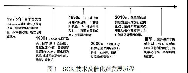 美国Engelhard 公司在1957年首次成功研发SCR 催化剂,由Pt、Rh 和Pb 等贵金属构成,具有很高的催化活性,但造价昂贵、温度区间窄、易中毒,不适于工业应用。日本日立、三菱重工等生产的V2O5(WO3)/TiO2(钒钛系)催化剂较早实现商业化应用。20世纪七八十年代,日本和欧美相继建造多套脱硝系统,钒钛系SCR 催化剂的商业应用趋于成熟,主要应用于电力行业烟气污染控制。近30年SCR催化剂在研究和应用方面都取得一定进展,具体发展过程如图1。发展至今,传统SCR催化剂生产与应用技术已得到普及,但核心技术由国外的几家大型公司掌握,如美国康宁公司、德国鲁奇公司、日本BHK公司等。