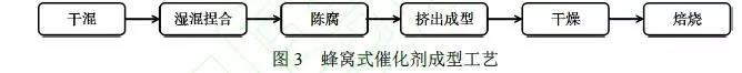 蜂窝类型的催化剂是目前应用最广泛的一类催化剂,成型方式可分为挤出成型式和涂覆式。挤出成型的工艺流程如图3所示。